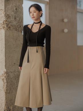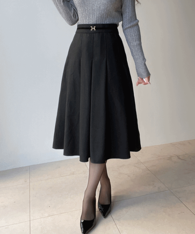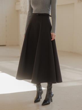 ウール混ジップアップスリットピンタックロングフレアスカート