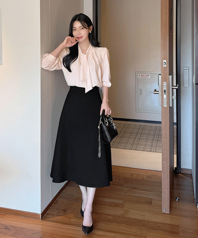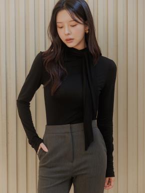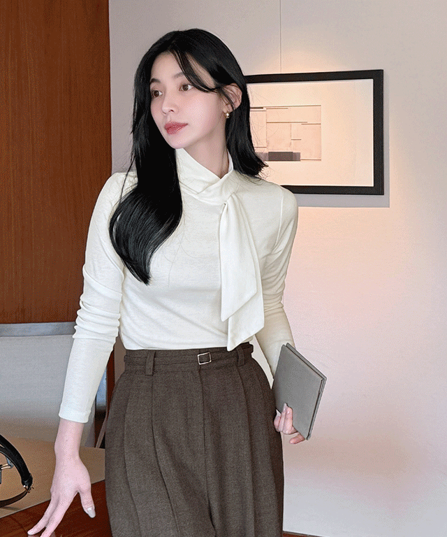 ソフトハーフネック長袖ルーズピンタックボウタイブラウス