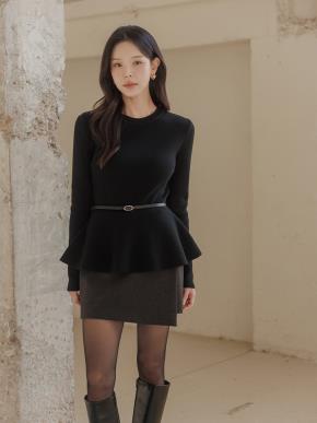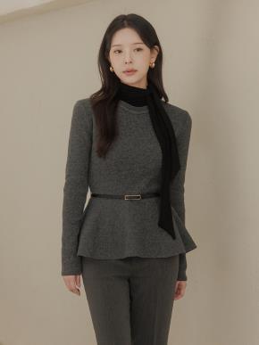 ストレッチウール混ラウンドネックペプラムスリム長袖ループ無地ニット