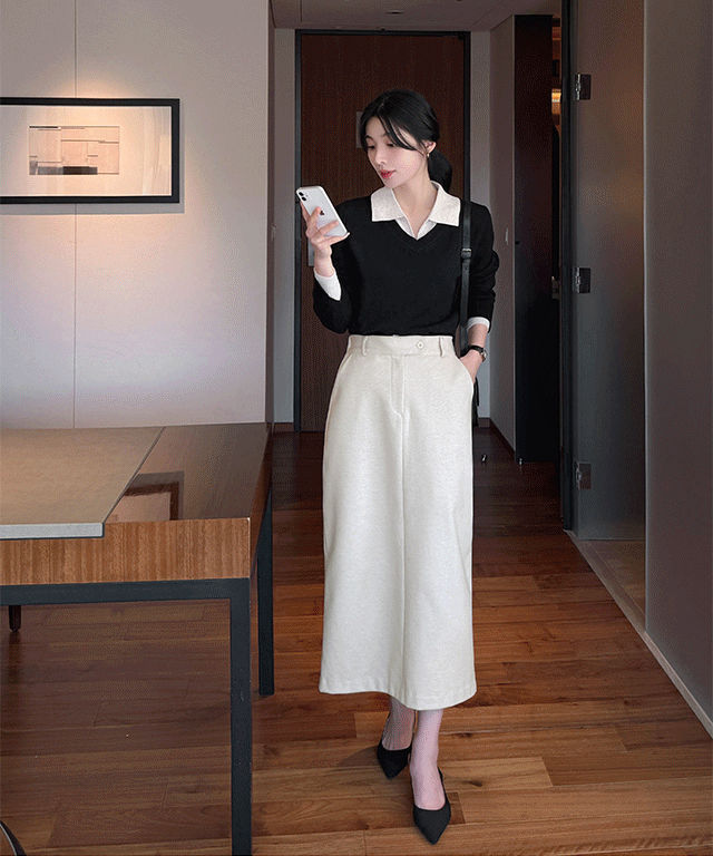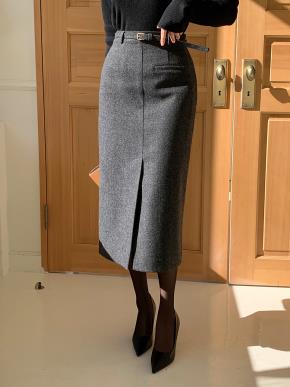 ウール混フェイクポケットスリットスリムジップアップHライン(ロング丈)スカート