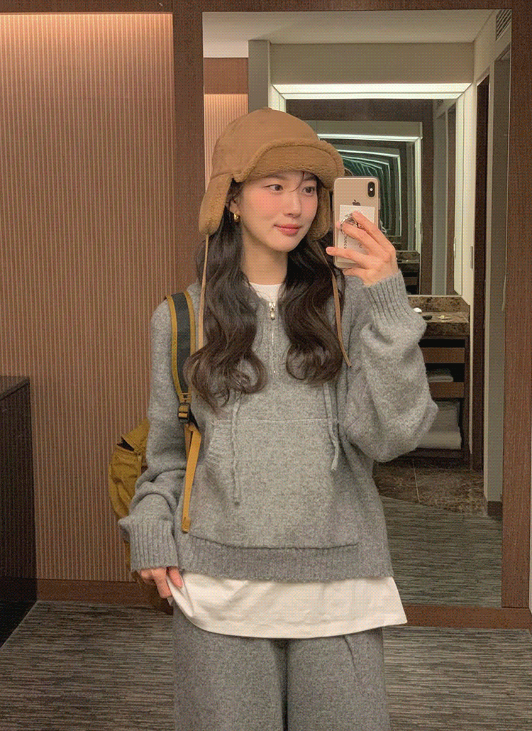 フードハーフジップカンガルーポケットウエストゴムワイドカラーセットアップ
