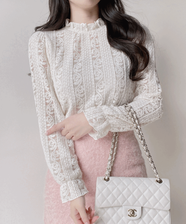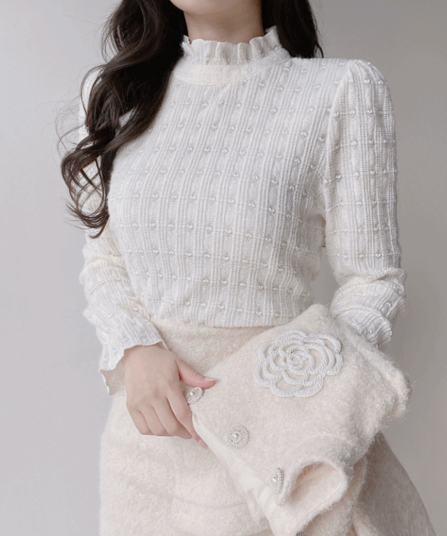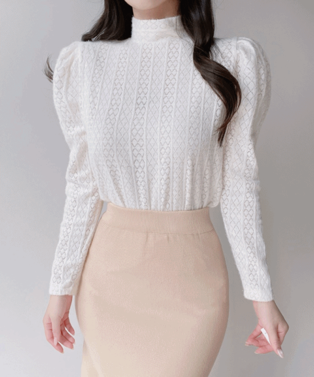 ニットレースアップパール調ボタンパフスリーブペプラムブラウス