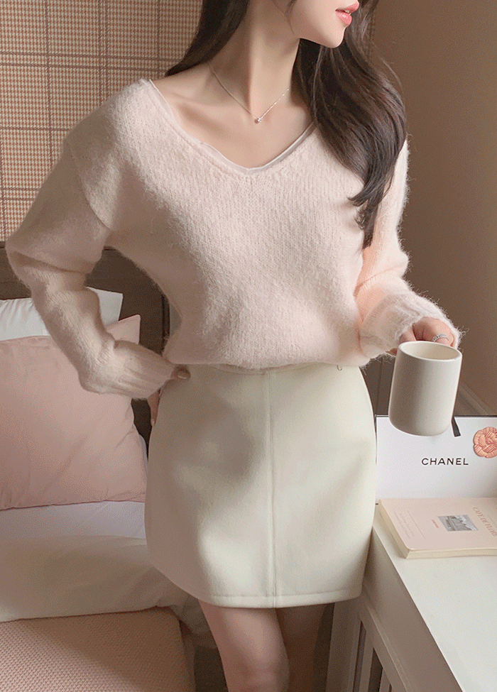 シャギーシフォンコンビウール混Vネックレイヤード風長袖ニット