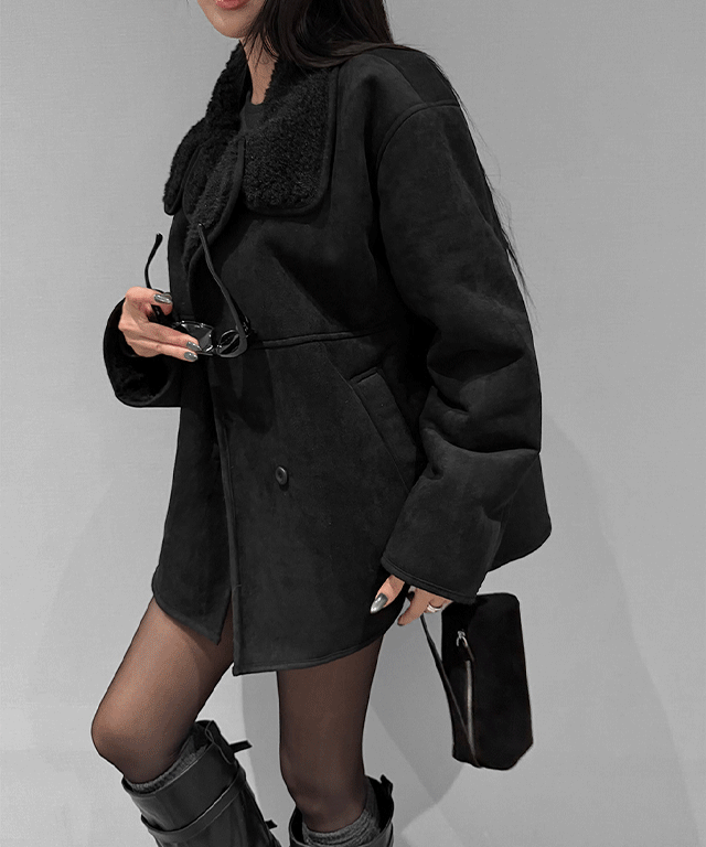ボアムートンスエード調ウール混ハイネックハーフネックポケットコート