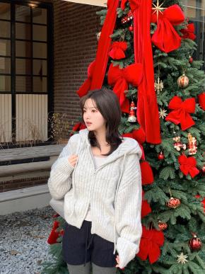 ニットダブルジップフード長袖ルーズケーブルカーディガン