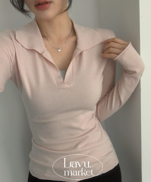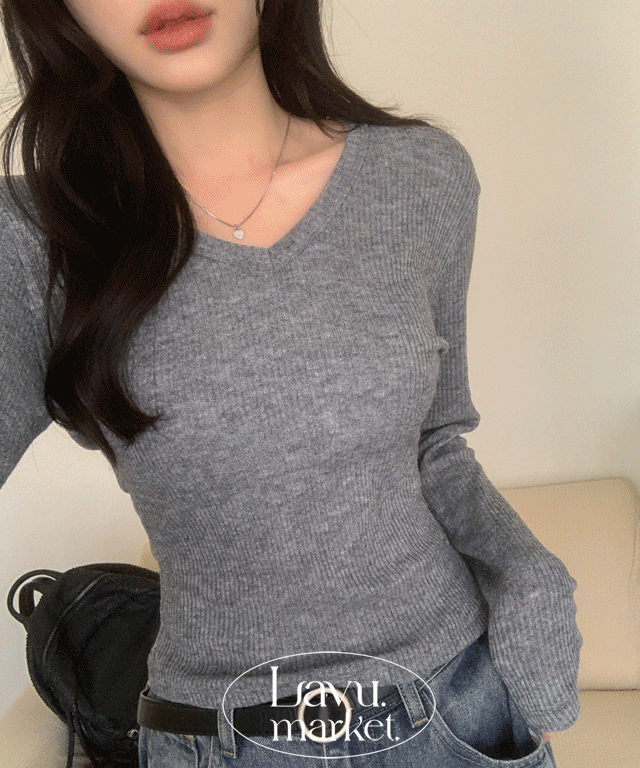 ストレッチリブセミクロップド長袖スリムVネックニットTシャツ