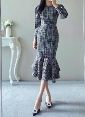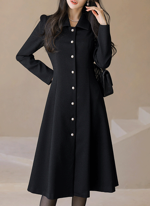 ツイードパール調ボタンAラインフレアカラーパフスリーブスリットワンピース