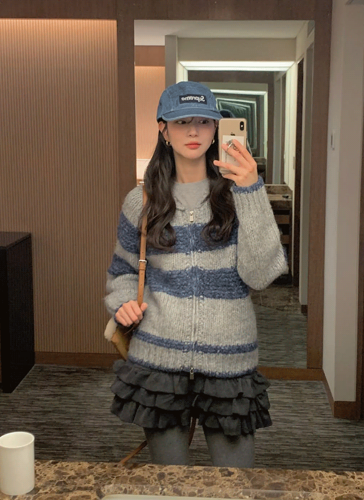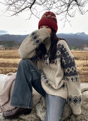 ニットルーズハイネック長袖ボクシー配色ノルディックカーディガン