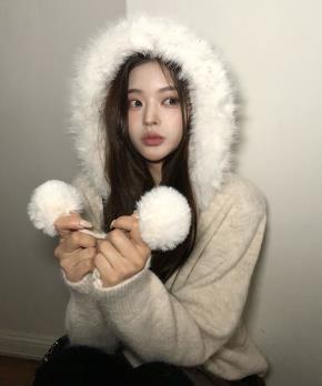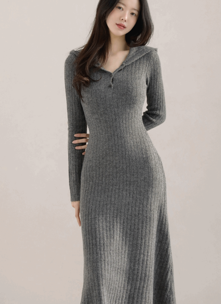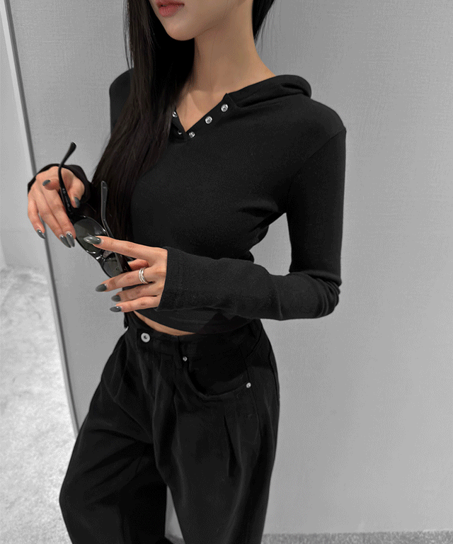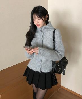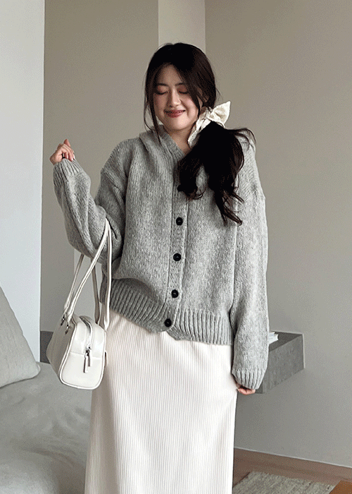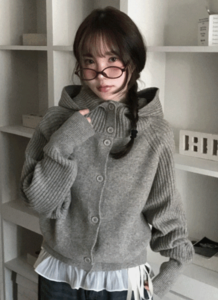 ニットボタンフードルーズ長袖ボクシーハイネックカーディガン