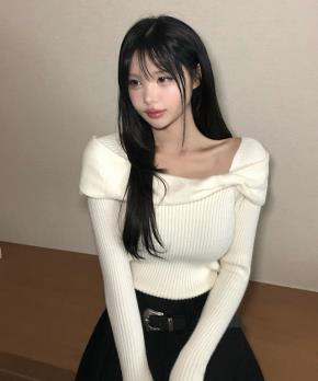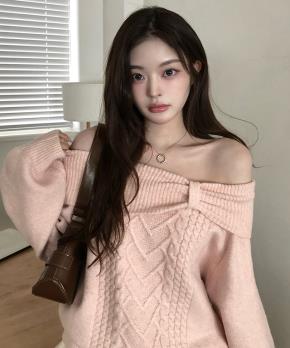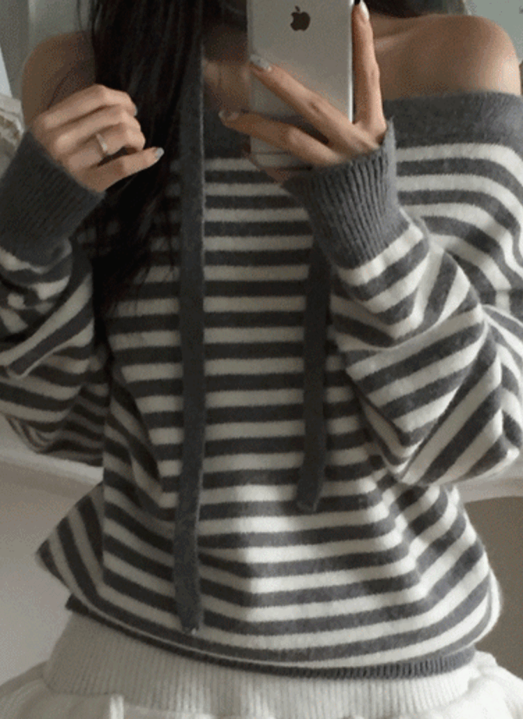 アンバランススクエアネックオフショルダー長袖リボン柄ニット
