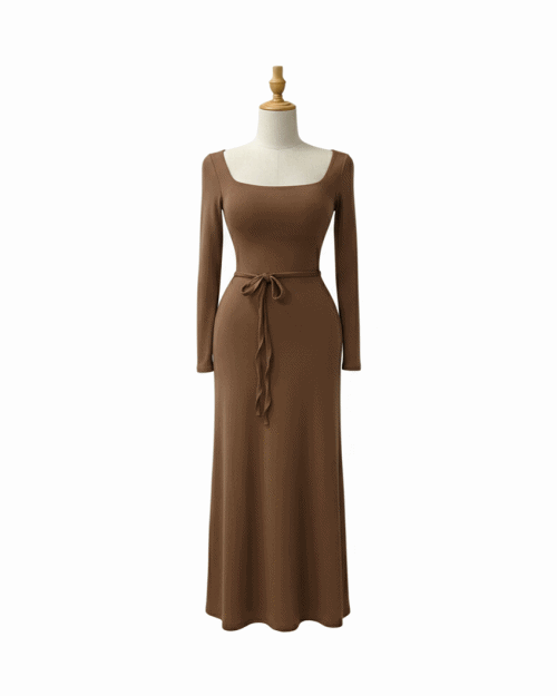 スクエアネック長袖ロングスリムリボンカラーワンピース