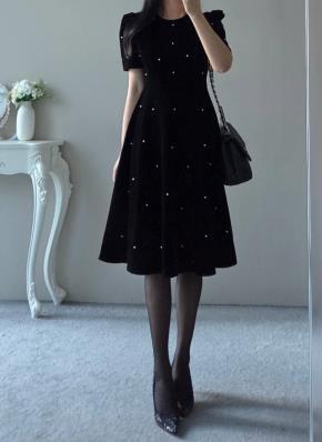 ベロアパールパフスリーブAライン半袖ラウンドネックミディワンピース