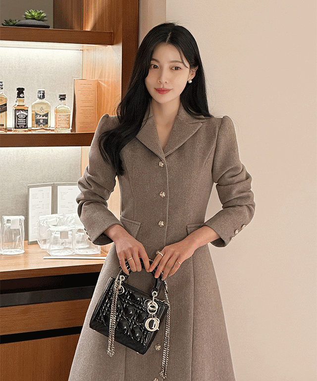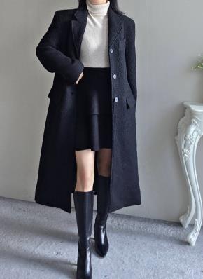 ウール混ブークレカラーロングボタン肩パッドポケットコート