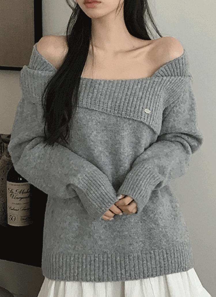 ウール混ペンダントオフショルダーアンバランスネックカラーニット