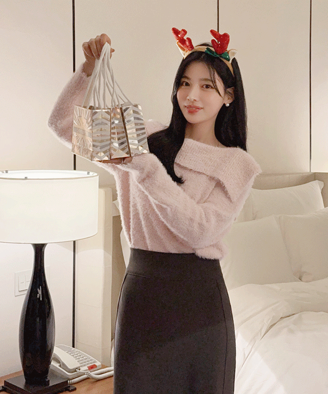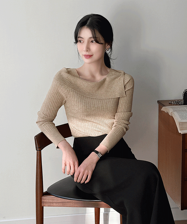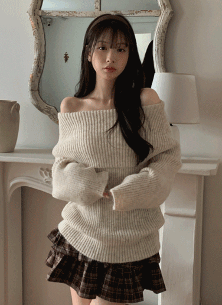 リブウール混オフショルダールーズオーバーサイズカラーニット