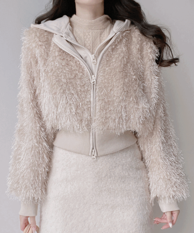 キルティングニット中綿コンビエコファーフードダブルジップスリムレイヤード風長袖ジャンパーダウンジャケット