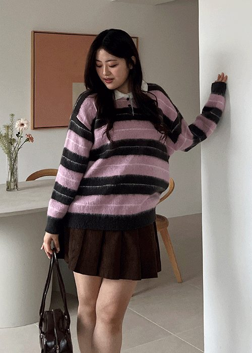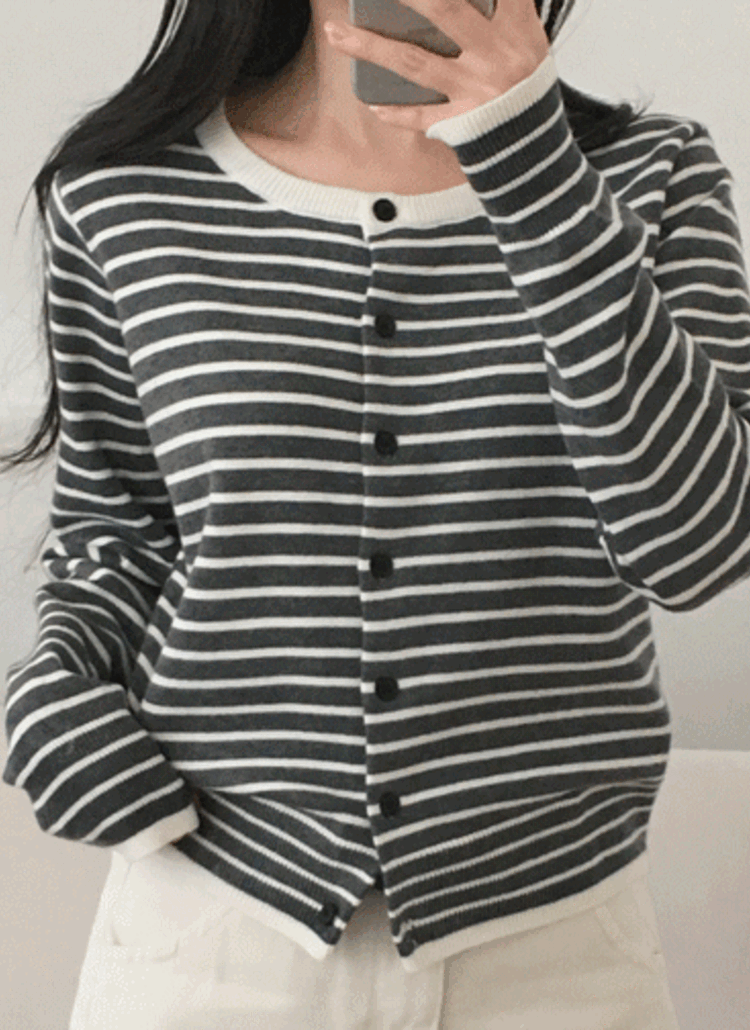 ラウンドネックボタンスリムボーダーカラーカーディガン