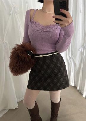 ウール混プリーツベルトサイドジップバックゴムチェックスカート