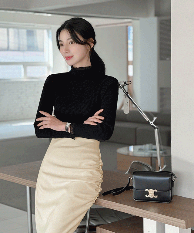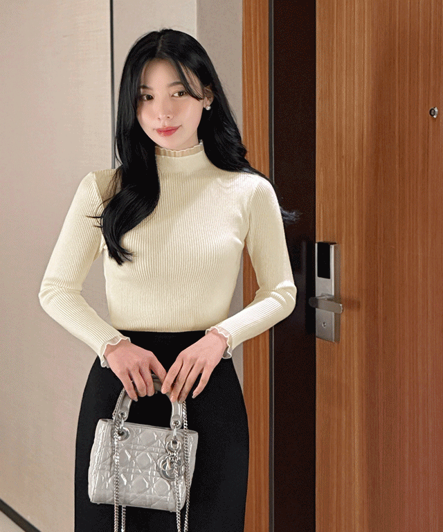 シースルーハーフネックフリルベーシックスリムレイヤード風長袖ニット