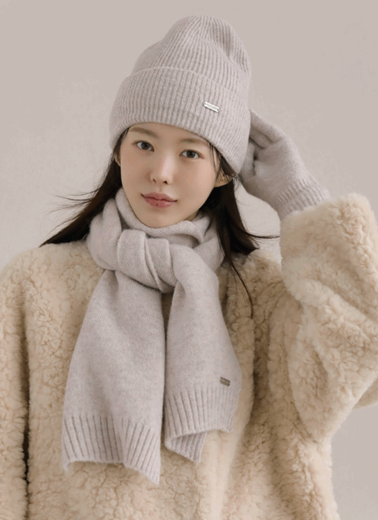 リブウール混ペンダントフィンガーホール無地手袋3 SETマフラー付ビーニーセット