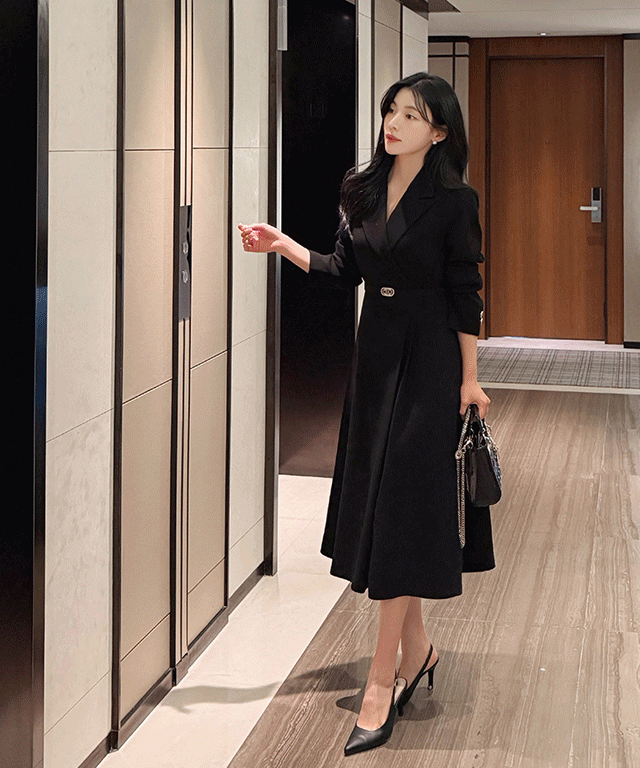 ジップアップスリムロング長袖フレアワンピースベルト付