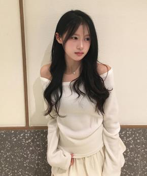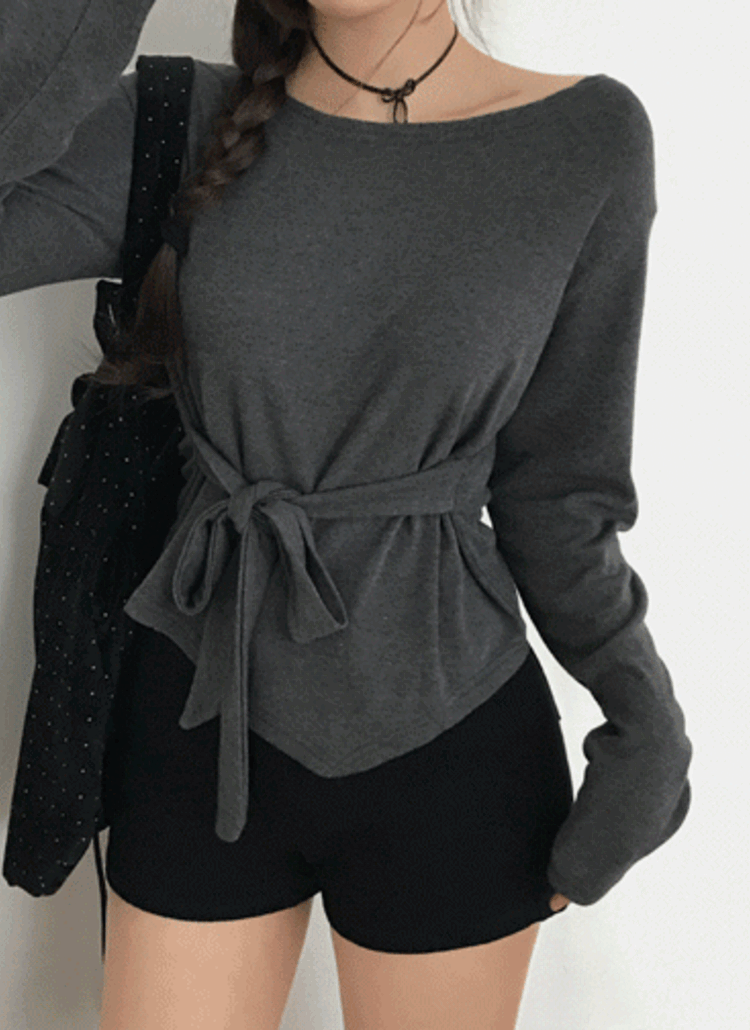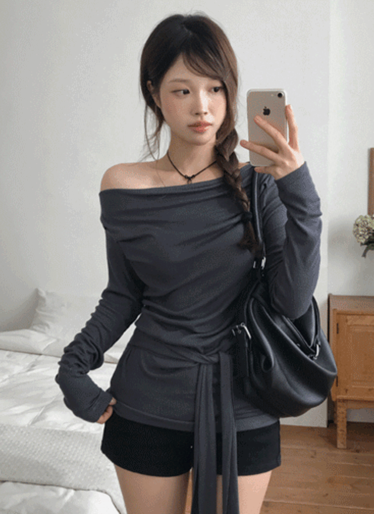 起毛リボンドレープボートネック長袖オフショルダーカラーTシャツ