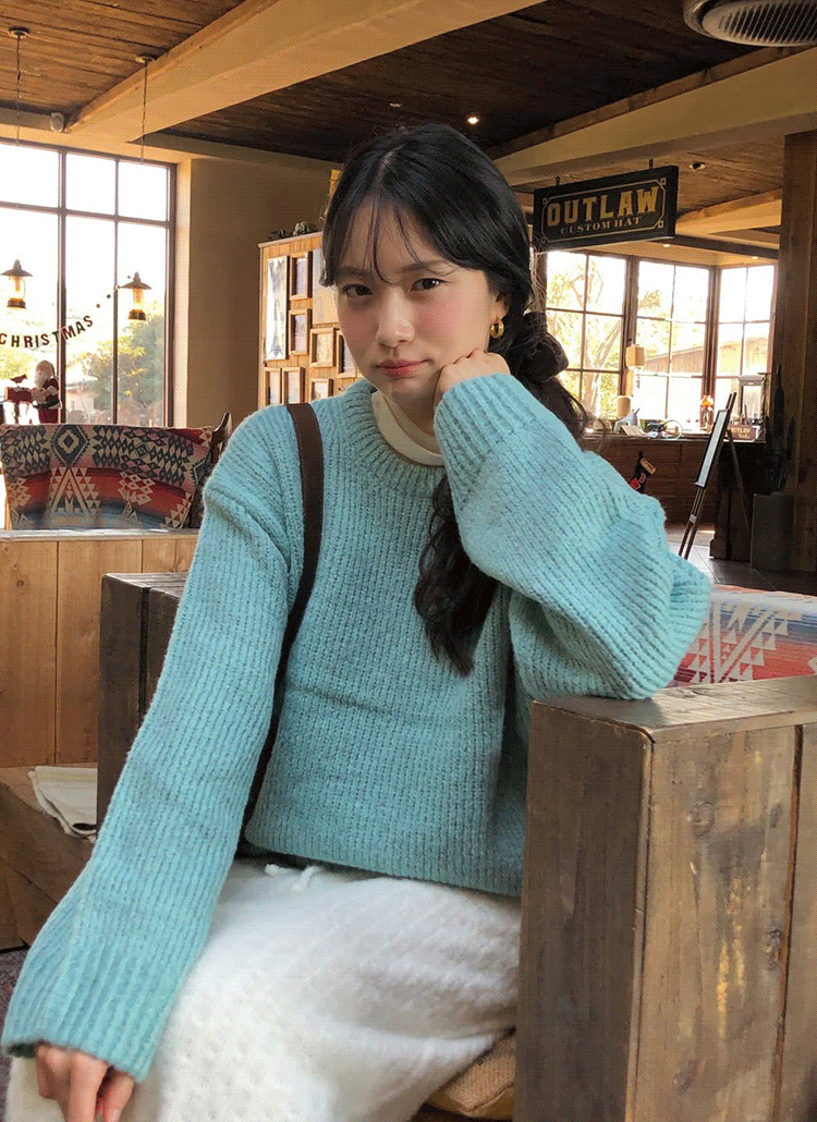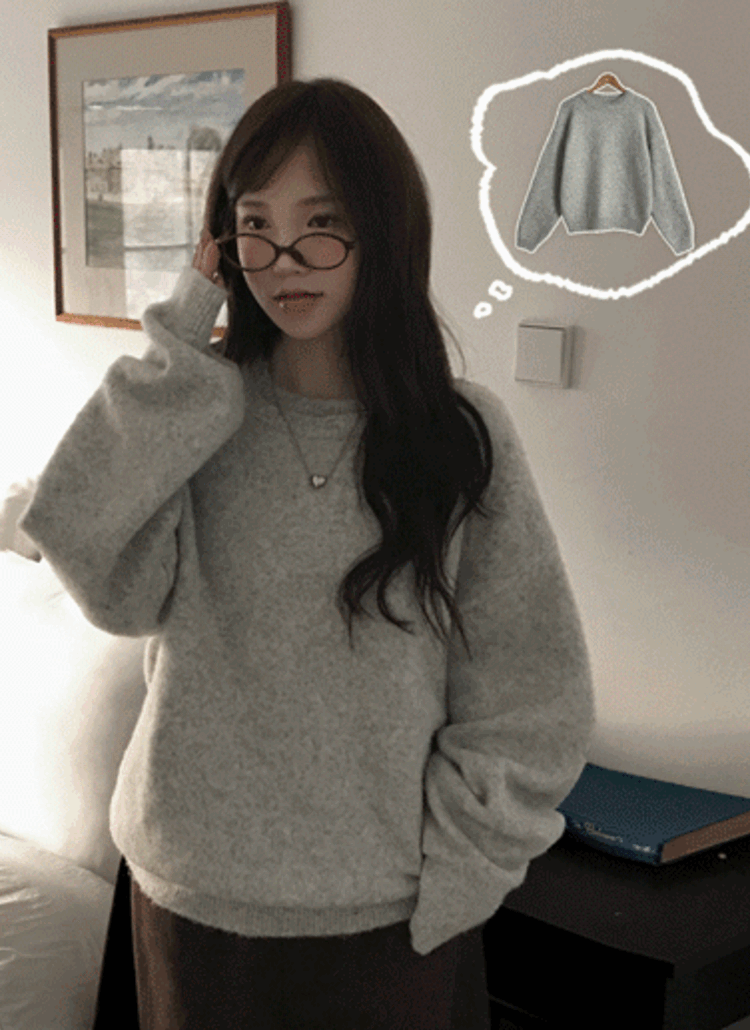 ウール混ラウンドネックベーシックルーズカラー無地ニット
