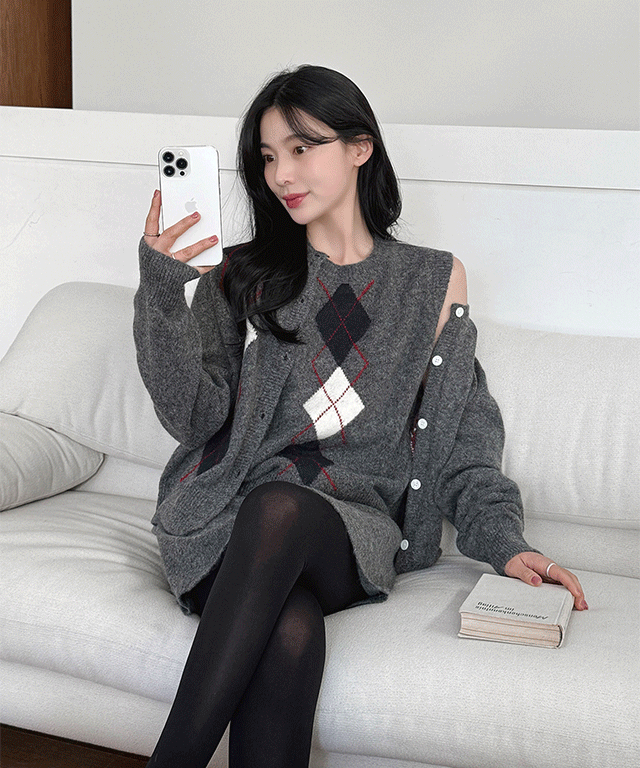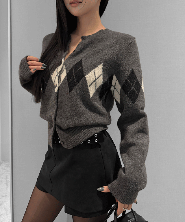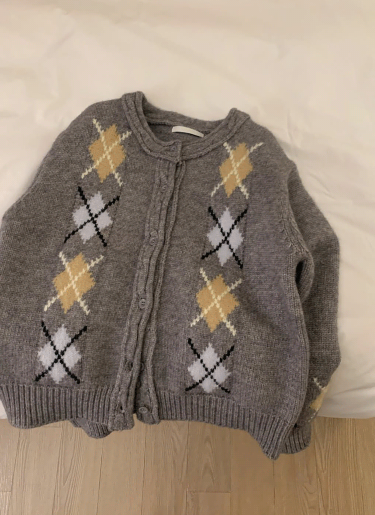 ニットボタンラウンドネックベーシック長袖アーガイルカーディガン