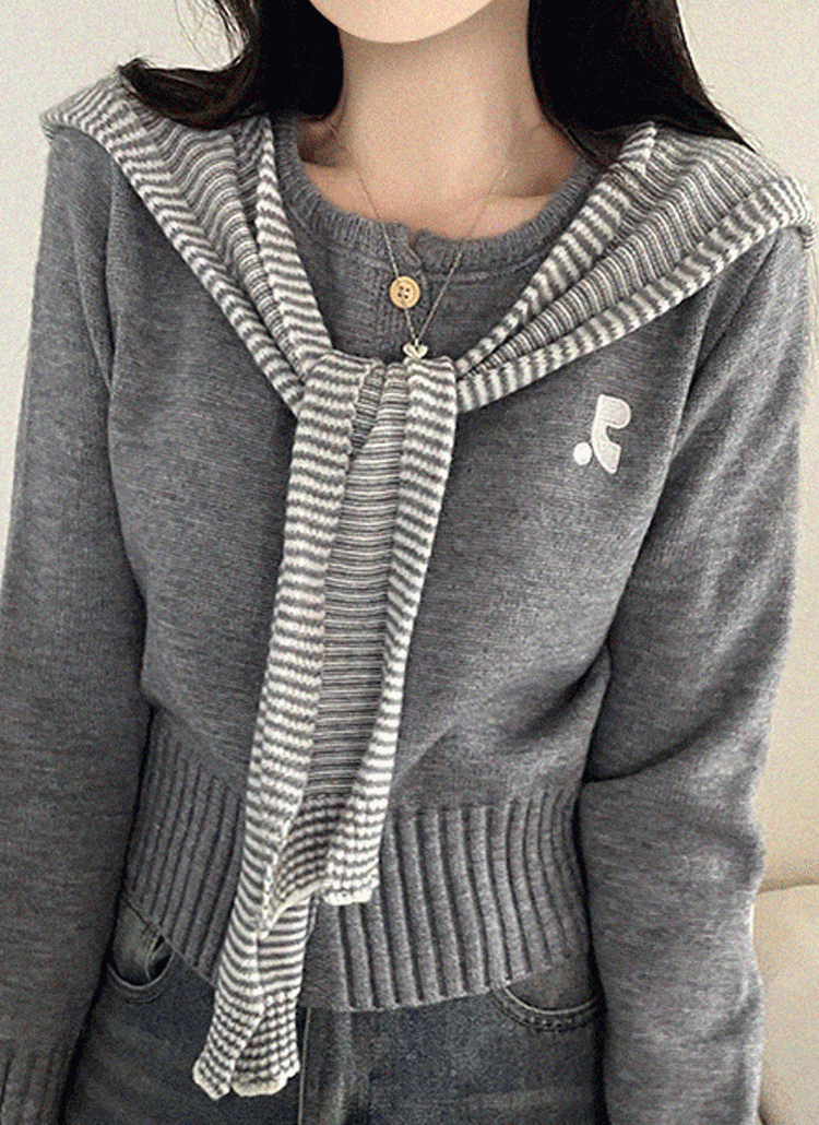 ラウンドネックルーズ長袖ペンダントボーダーニットマフラー付