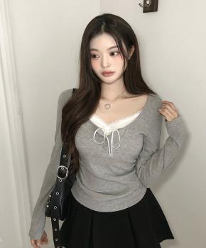 裏起毛ストレッチVネックスリムレイヤード風長袖ギャザーTシャツ