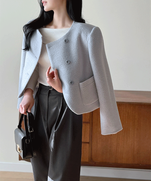 メランジウール混ボタンカラーポケットベーシックスリム長袖スナップボタンジャケット