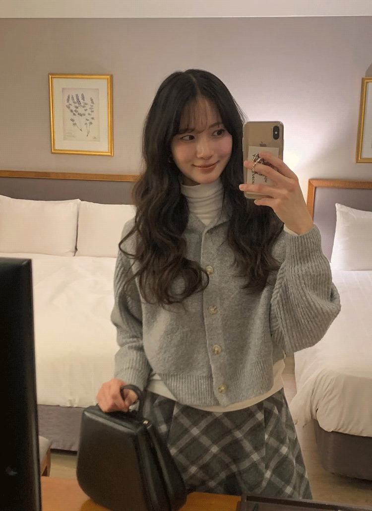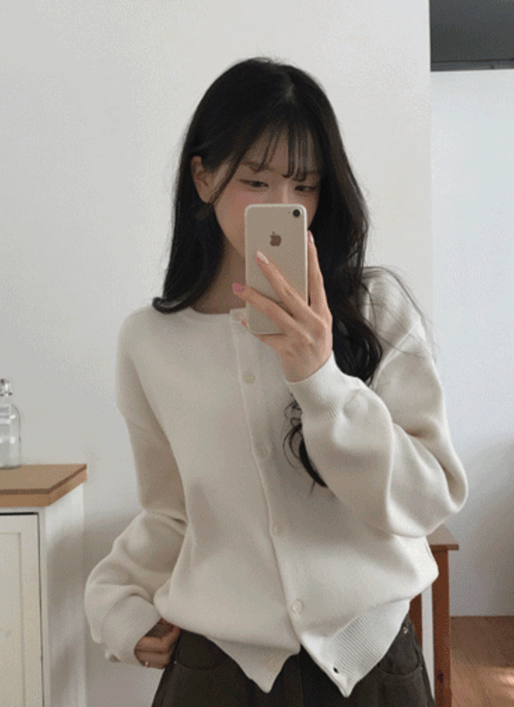 ウール混ボタンラウンドネックベーシックカラーカーディガン