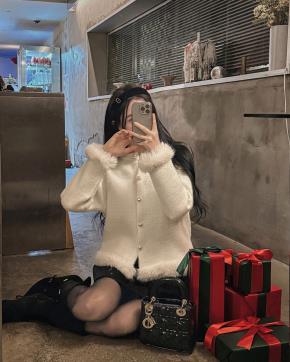 ソフトエコパールエコファーラウンドネックパール調ボタンクロップド長袖カーディガン