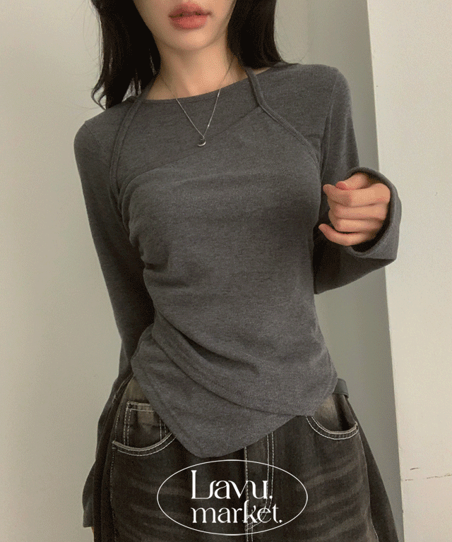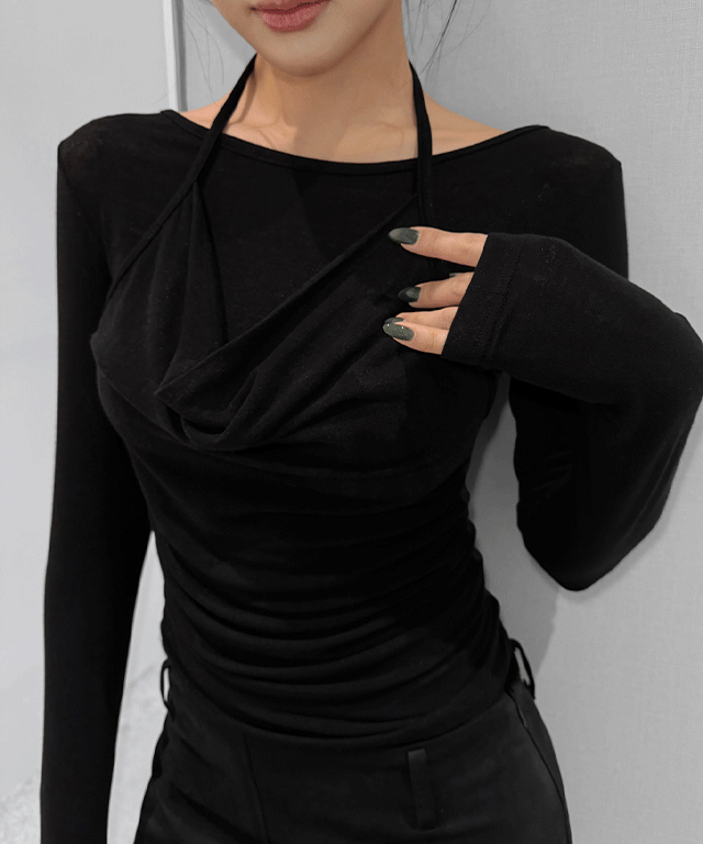 リブストレッチホルターネックスリムレイヤード風長袖ギャザーTシャツ