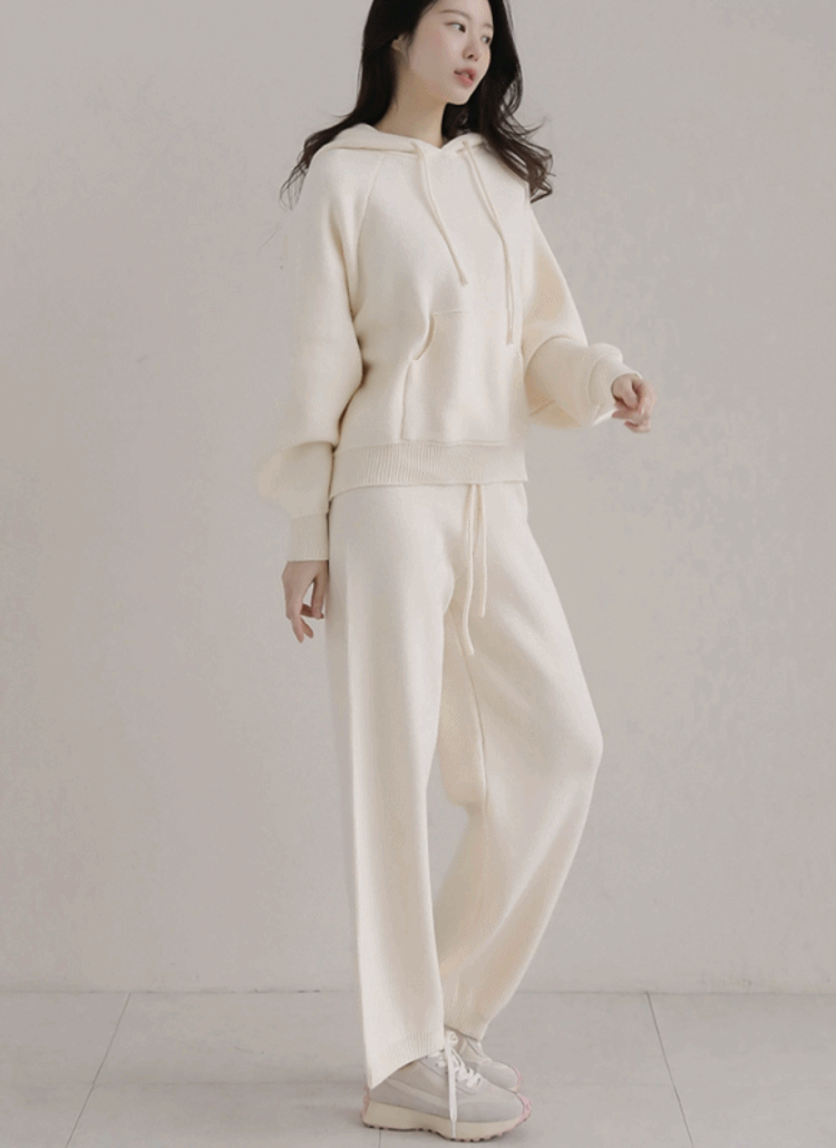 ルーズフードラグランワイドウエストゴムドローストリングカンガルーポケットセットアップ