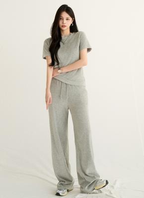 ベロアウエストゴムワイドラウンドネック半袖刺繍セットアップパンツTシャツトレーニング