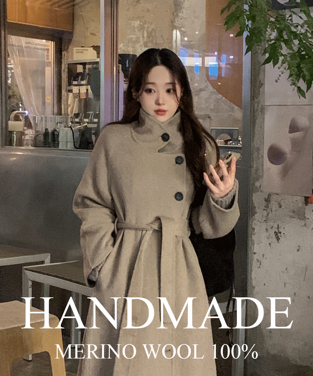 ウールボタンハイネックポケットボクシーロングルーズ長袖コートストラップ付
