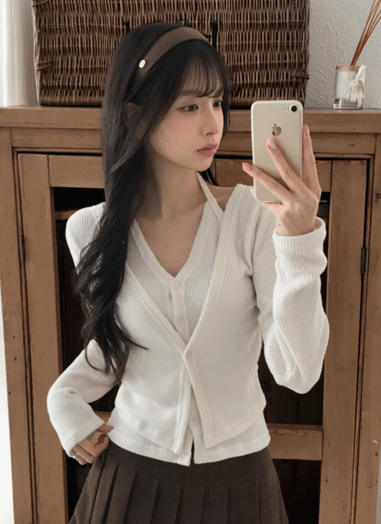 レイヤード風ホルターネック長袖ボタンカラーカーディガン