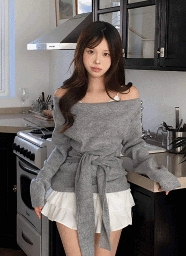ブークレウール混オフショルダールーズカラーニットストラップ付