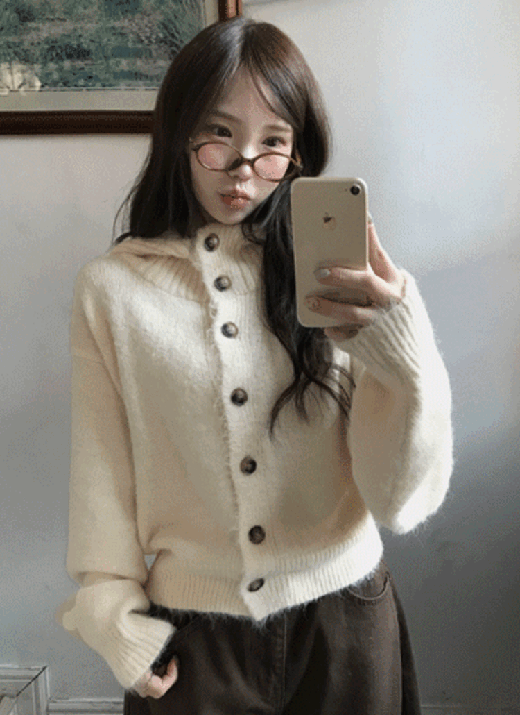 アンゴラ混ハイネックフードボタンルーズカラーカーディガン