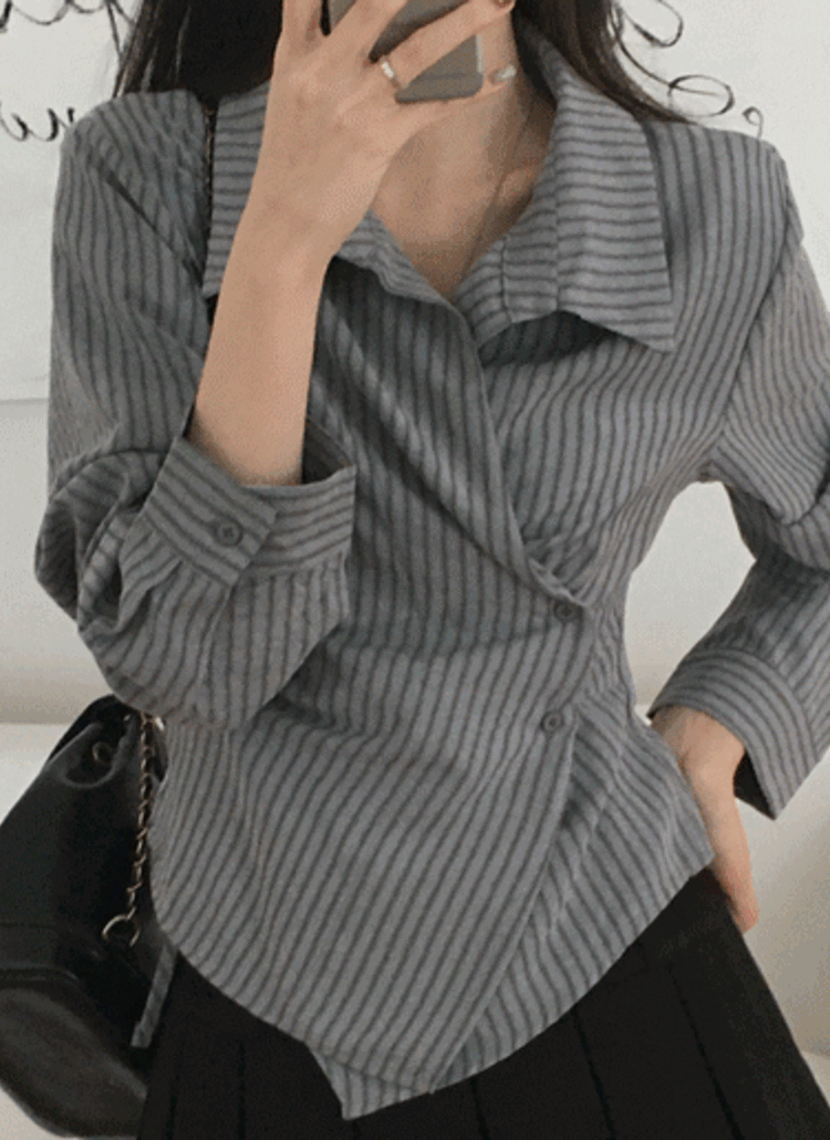 リブストレッチアンバランスネック長袖スリムフェイクボタンニット