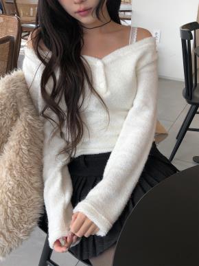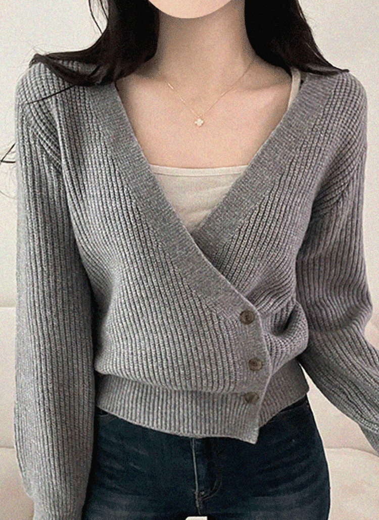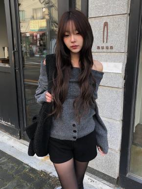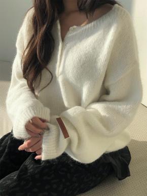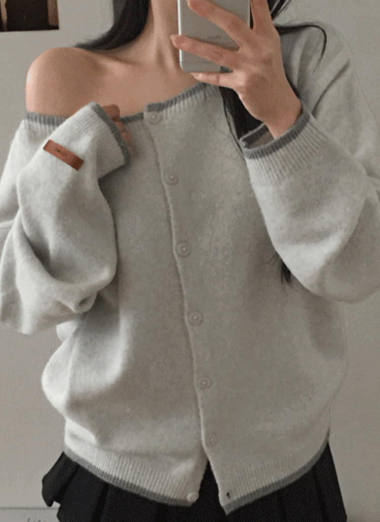 リブニットボタンカラーオフショルダー長袖カーディガン
