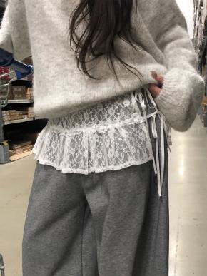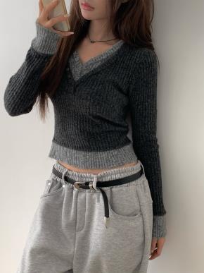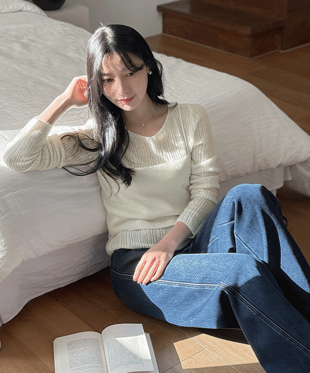 ウール混ラウンドネック長袖レイヤード風ドローストリングスリットニット