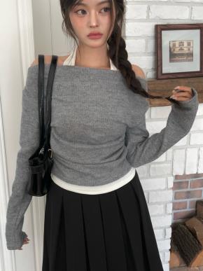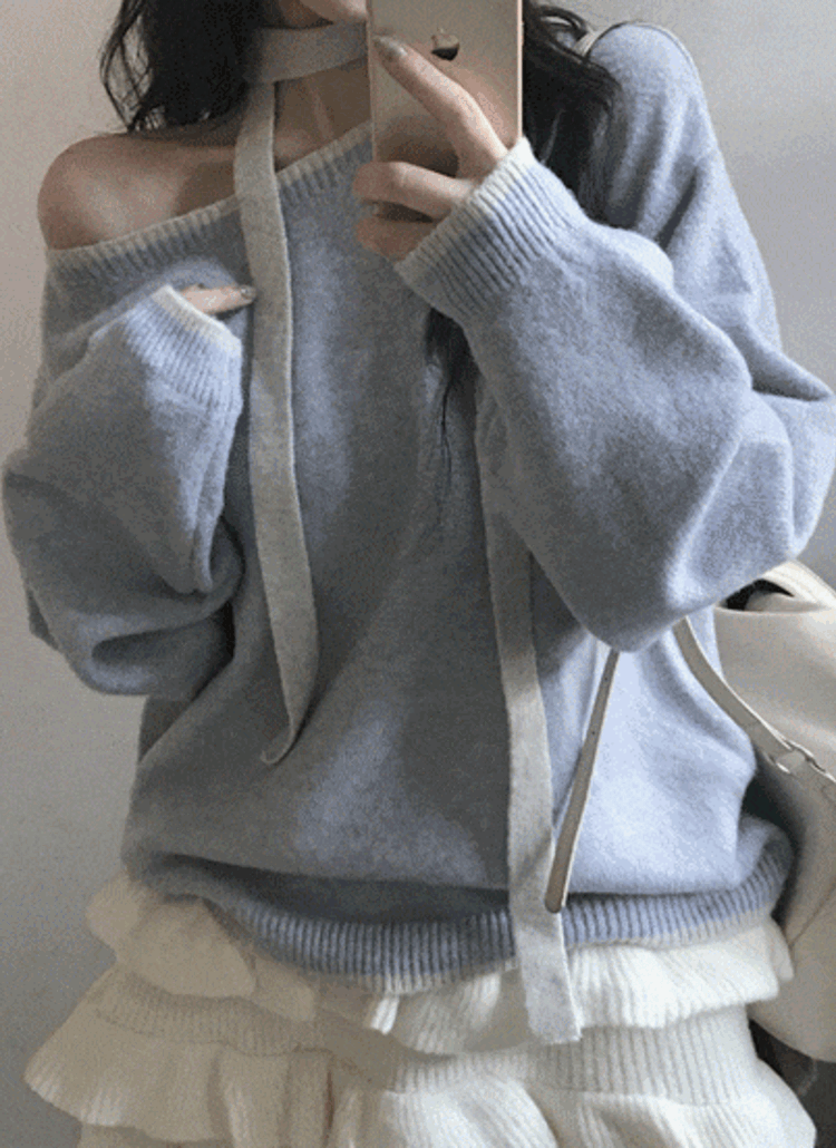 ドレープオフショルダーホルターネックシャーリングレイヤード風カラーニット