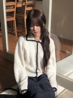 配色ウール混ラウンドネック長袖ボタンルーズカーディガン