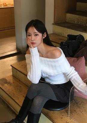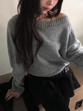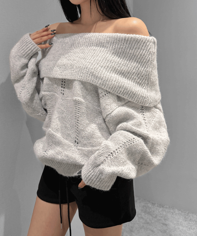 ウール混モヘア混ボートネックワンショルダールーズカラーニット