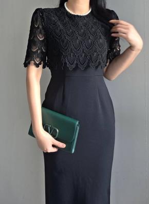 レース半袖Hライン(ロング丈)ケープラウンドネックレイヤード風配色ワンピース