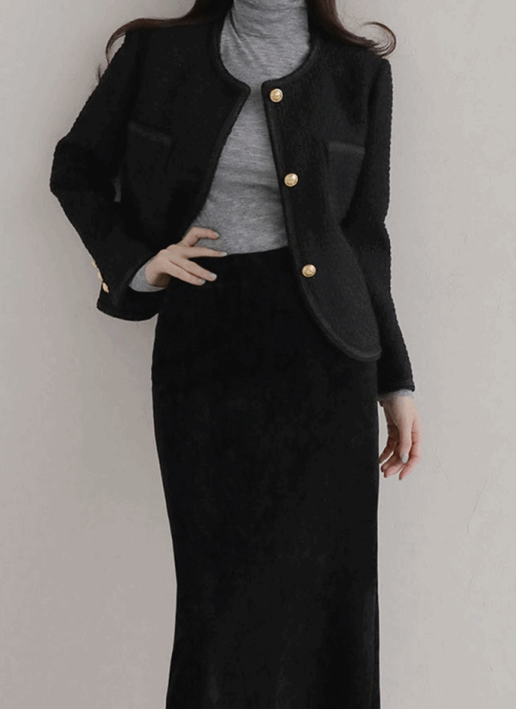ツイードラウンドネック長袖ボタンショートゴールドボタンジャケット