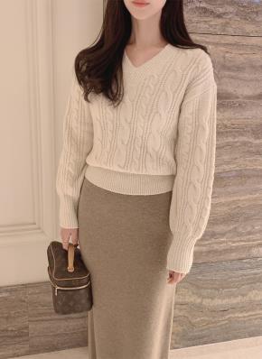 ウール混ラウンドネックベーシックケーブルカラーニット