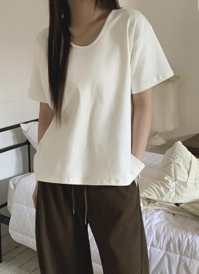 ベロア肩パッドラウンドネック半袖クロップド無地Tシャツ